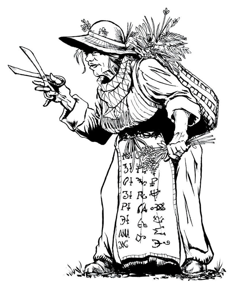 Willhomeena knows almost every plant in the land—and how to pulverize each bit for the best uses. She knows that Yellow Wolf’s Bane is best picked in the early morning of the spring for fullest potency, and that it is wisest to use shears to cut Adder’s False Tongue, instead of pinching off the plant. Better yet—you should pull Yellow Wolf’s Bane first, since you can dry and grind the root into a powder that acts as a powerful insect repellent if you boil it with linseed oil—but never wear this in the Lower Cradainic Mountains, lest the blue iridescent vulture flies eat you alive (literally, that is how she lost poor Shawn, her porter who had the spikiest of hair).