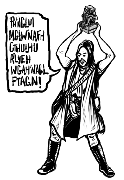 Cthulhu as a patron for Dungeon Crawl Classics was the germ of the idea that eventually led to the creation of Tales from the Smoking Wyrm. While playing a session of DCC at Gary Con X, Brian wondered why his cleric could draw power from Cthulhu as a god, but that there was no vehicle to do the same for a wizard—after all, the crazed cultists described in Lovecraft’s (and other Mythos writers’) works seem well-suited to be portrayed by a wizard’s search for power in long-forgotten or unmentionable eldritch tomes. The corruption mechanics built in to DCC were ripe for a patron like Cthulhu, and after scouring numerous other DCC zines to ensure no duplication of effort, our version was given life—LIFE, I TELL YOU!!!